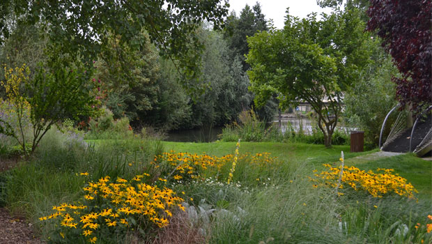Our garden pays homage to this important part of the history of Amiens and the remnants of an industry through a series of interwoven threads of yellow and blue planting across a large area of the island. The garden is represented as a remnant of woven cloth through planting and threads of black stained timber edging. It is predominately all about plants and how they can combine to create a dramatic space that will be used as a focus for future festivals.