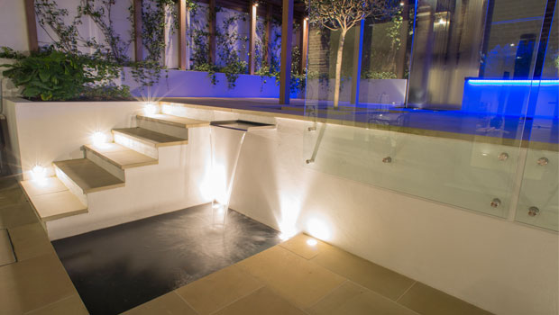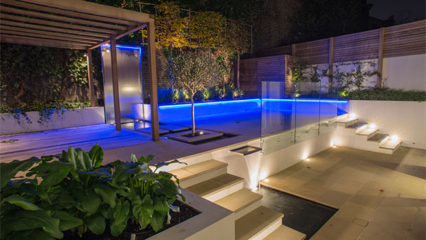A contemporary city garden with plenty of space for entertaining and dramatic views at night-time from the house using water and lights to create a real wow factor. But this is quite a small space that resolves the issue of a large level change by utilising it to best advantage with water and glass balustrading to help create the feeling of space.