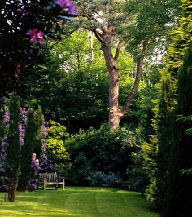 The garden features a traditional driveway to reflect the Arts & Crafts House and garden with formal Yew hedges and stoneware. A pool to the rear, lawns, a Cherry tree avenue and woodland walks form the backbone of the rear garden whilst a large lawn vista (shown) is often used for play or a quieter area, making use of substantial Rhododendron planting that comes into flower in the spring.