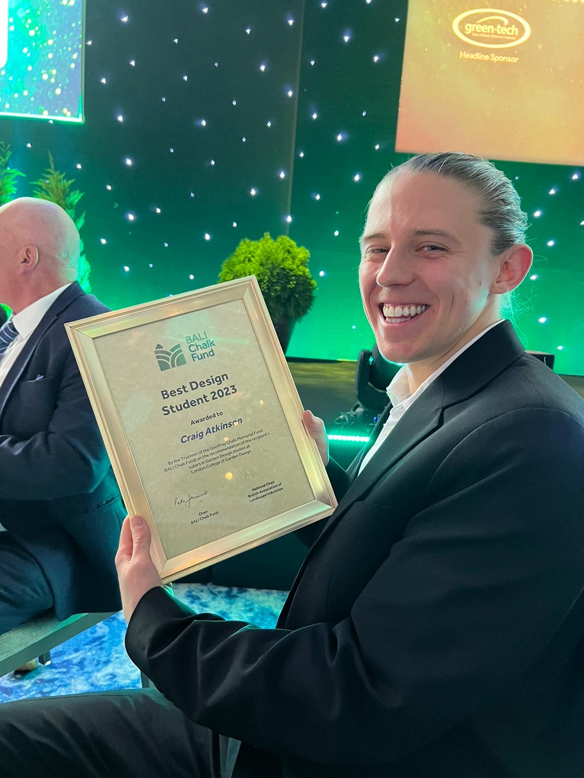 At the annual BALI Awards last Friday where the best of the UK landscape professions are celebrated, London College of Garden Design Graduate Craig Atkinson was awarded the 2023 BALI Chalk Fund National Garden Design Student of the Year.