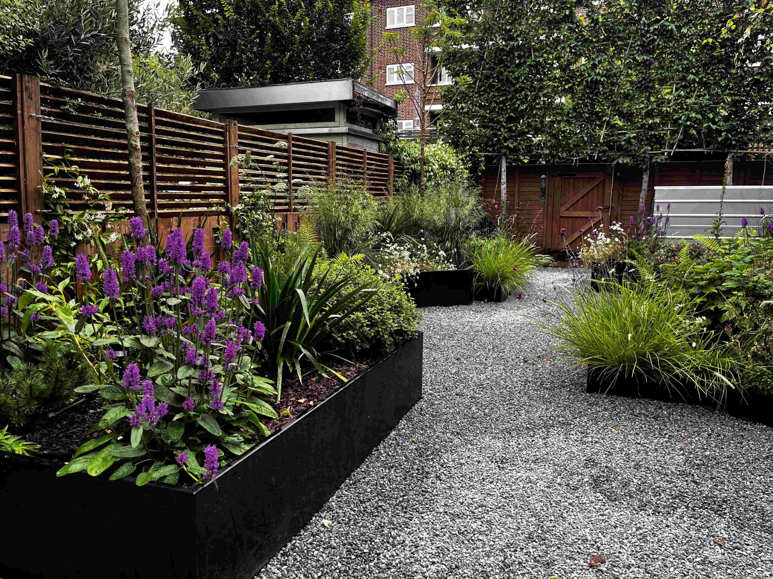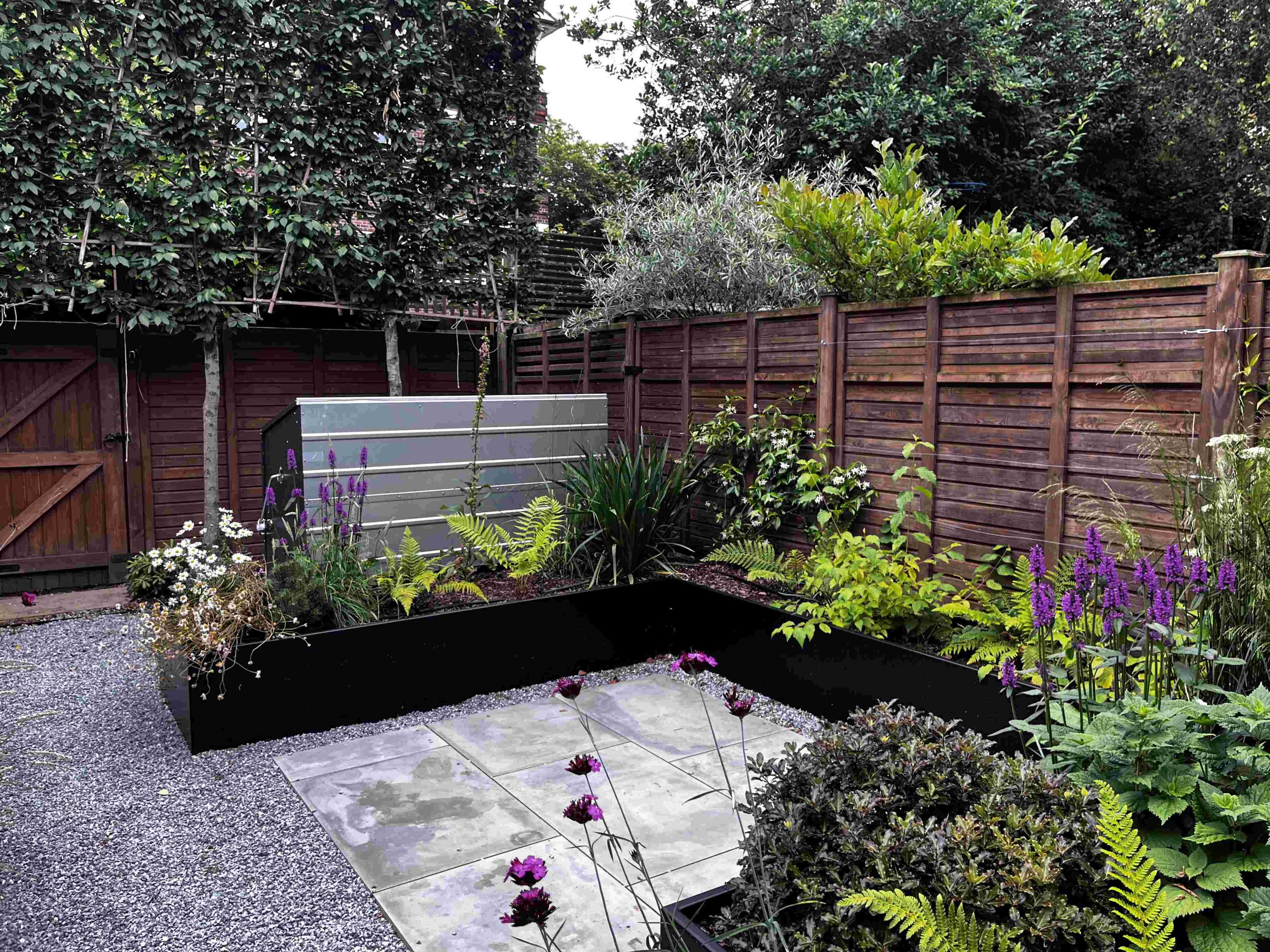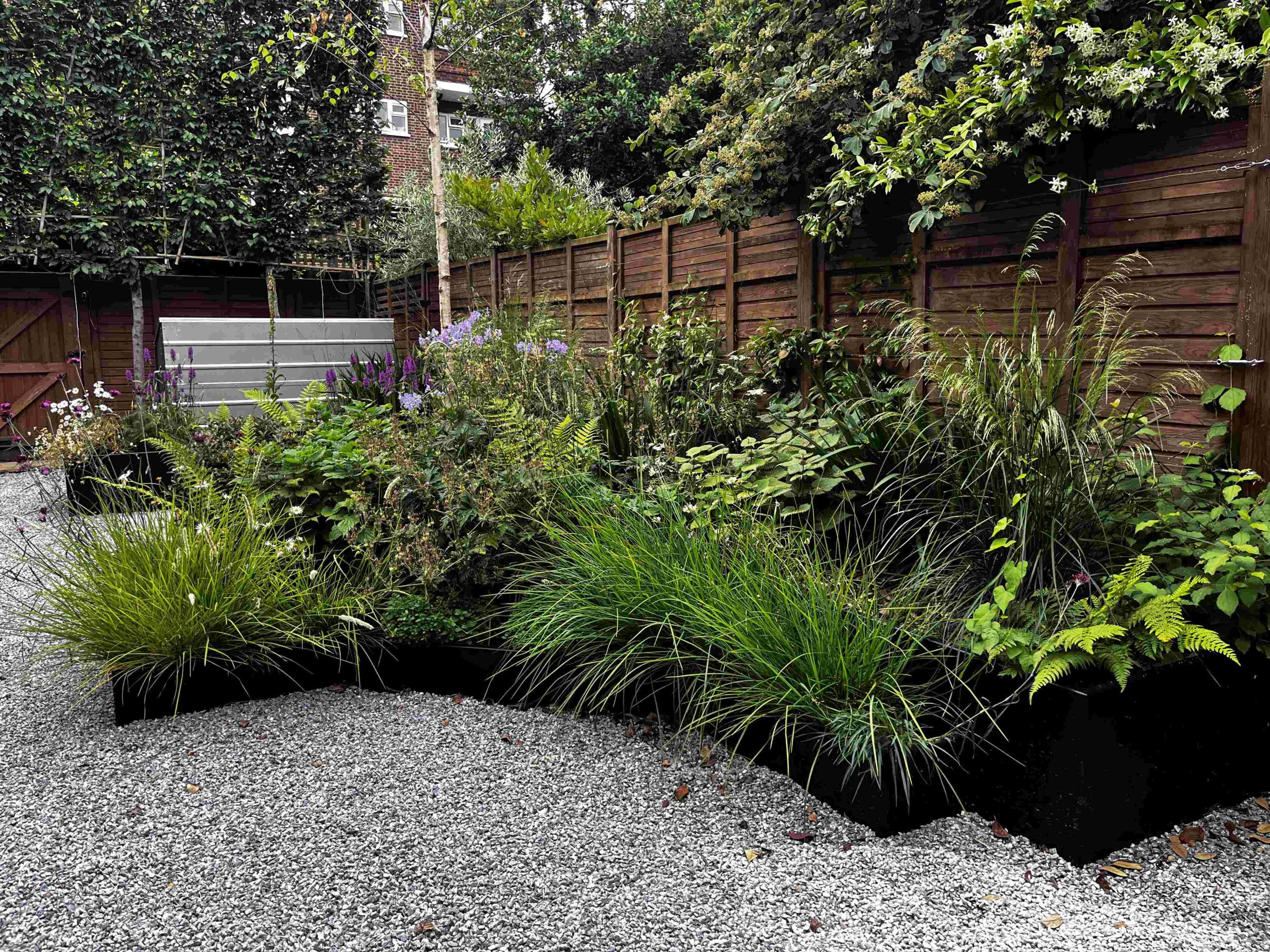 The original idea for this garden was to create a garden that was practical for the clients. Originally it was a square lawn with beds wrapping around the sides. The goal was to emulate the newly installed garden on top of Battersea Power Station with its geometric metal planters/ raised beds with naturalistic planting that’ll change over time. We installed a small terrace that’s situated within the planters, so you can enjoy a morning coffee and feel surrounded by soft planting. Three large trees trees anchor the design, each with its own up-light to add interest looking out from the property. Sorbus aucuparia (Rowan), Betula pendula (Birch) and Crataegus x prunifolia (Hawthorn). Trees that provide long seasons of interest with flowers, berries or autumn colour.