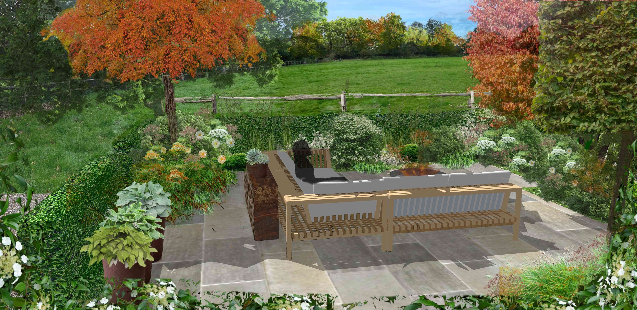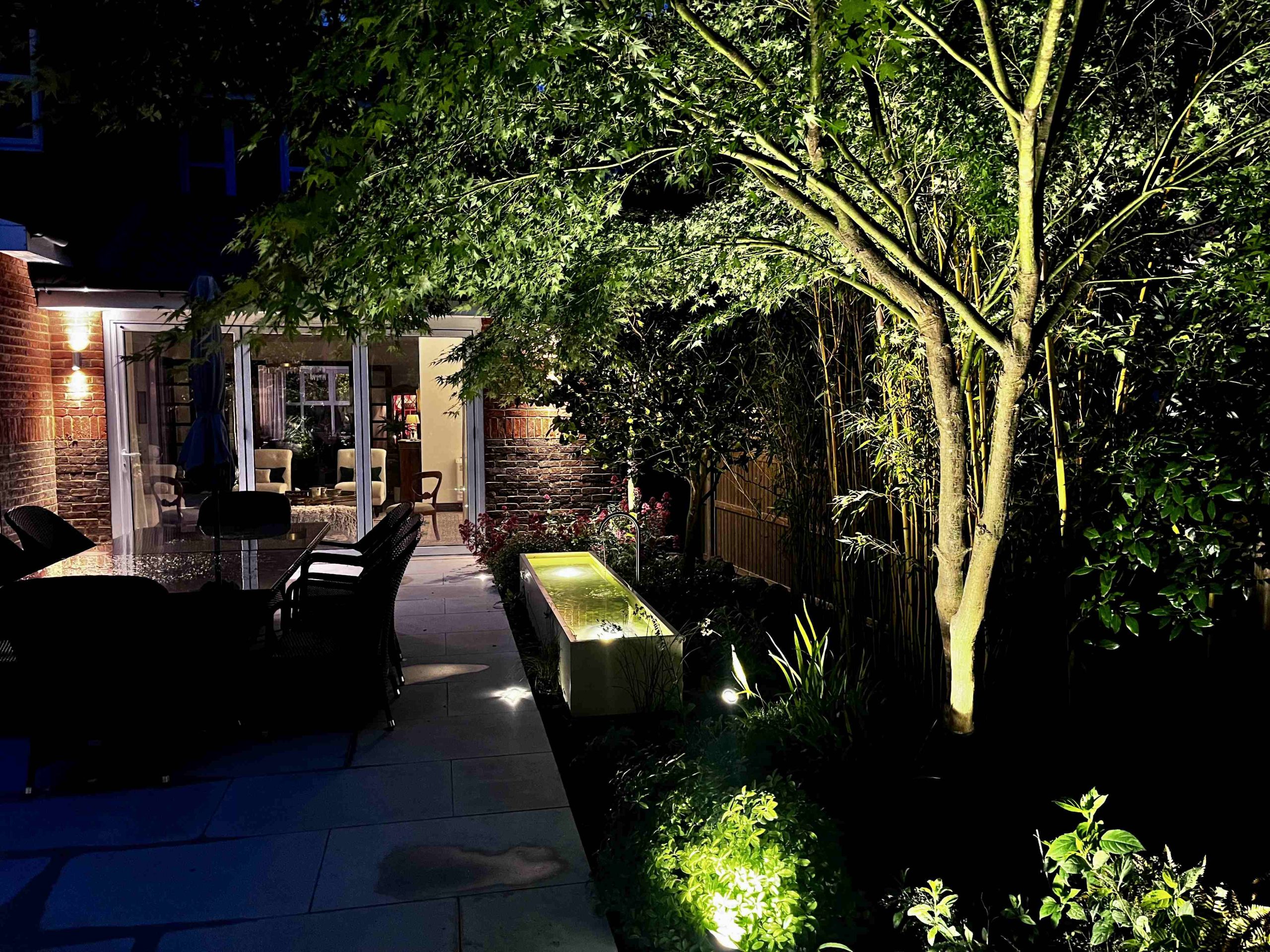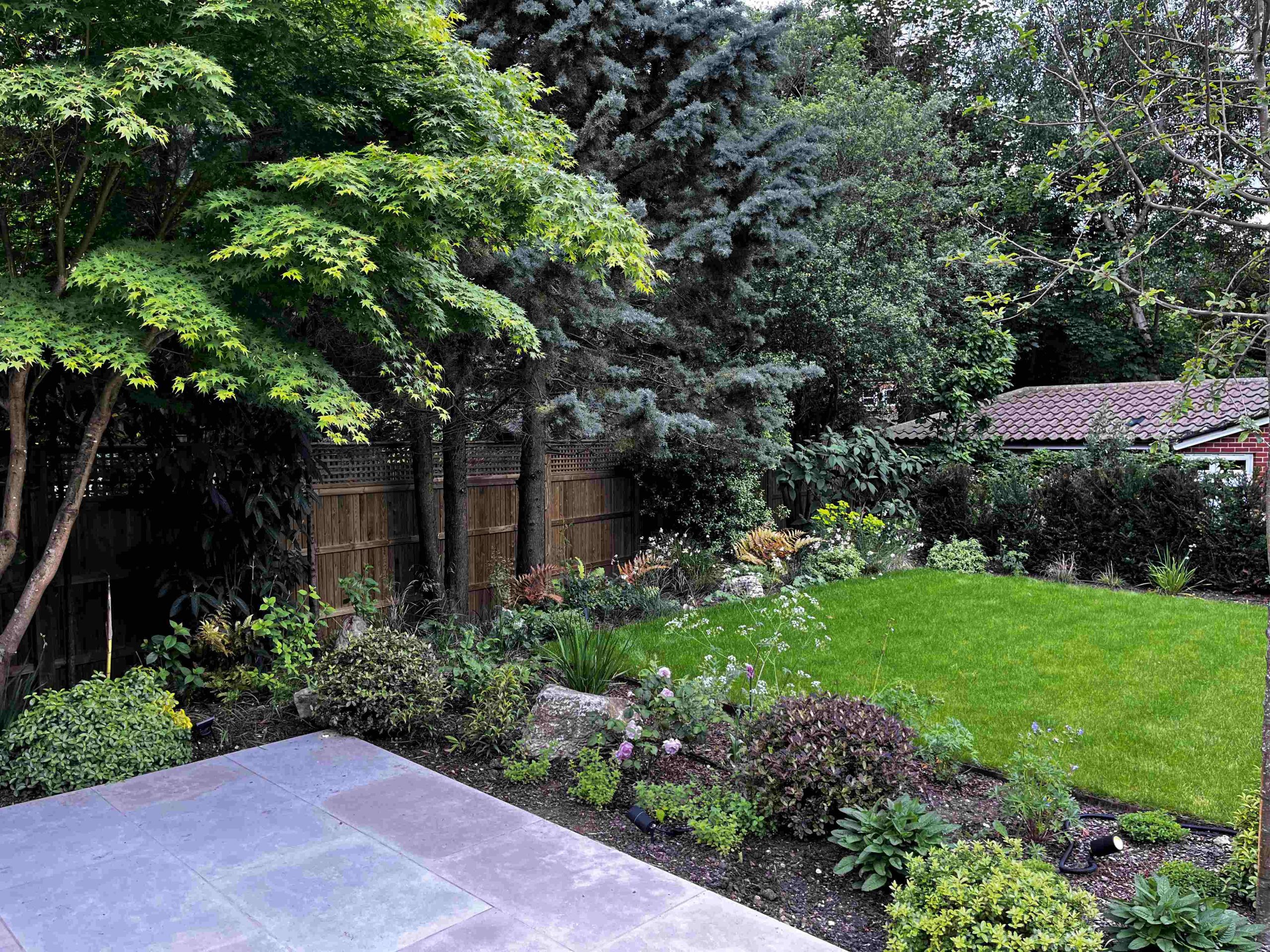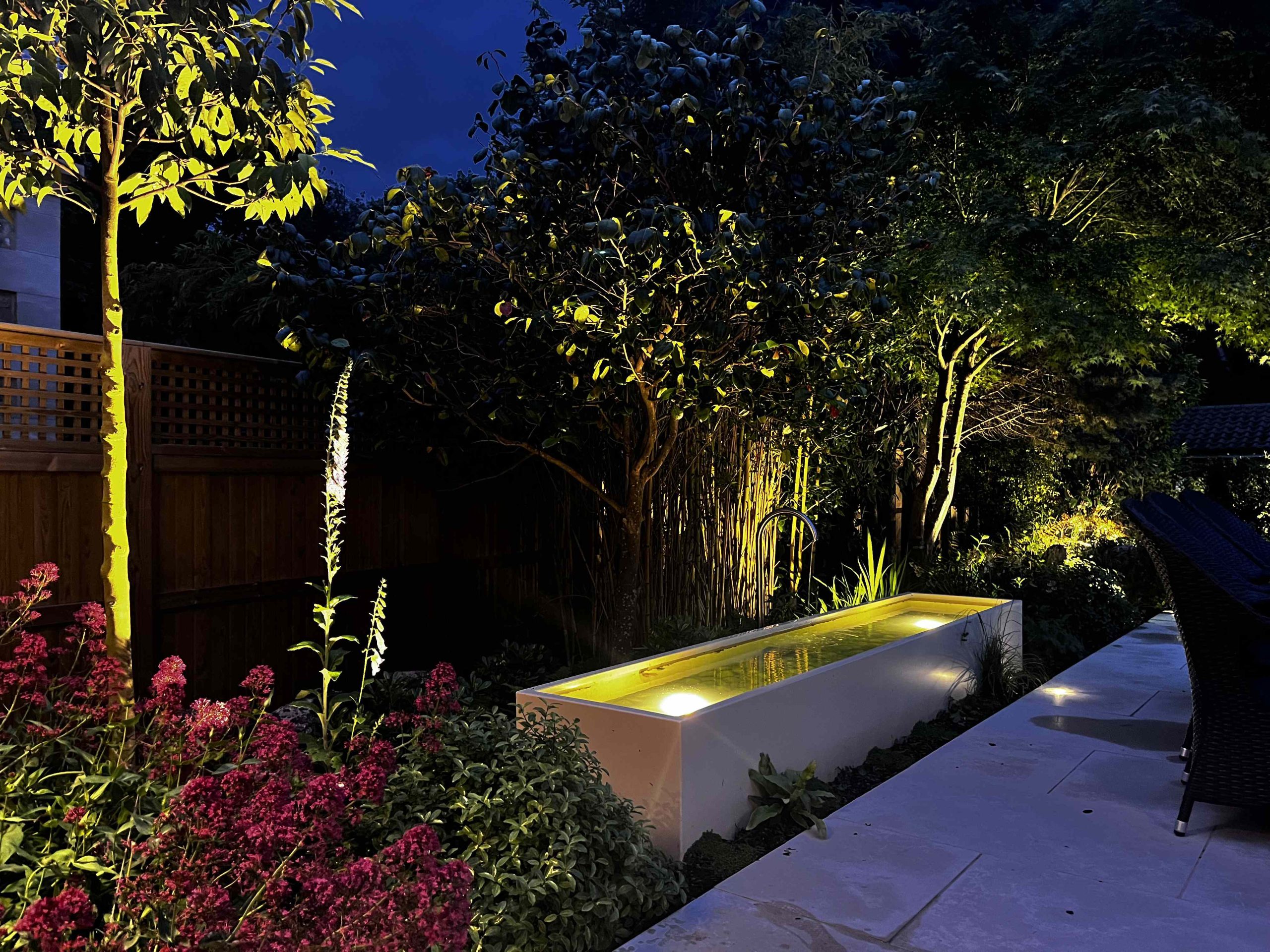 The original idea for this garden was to create a garden that was practical for the clients. Originally it was a square lawn with beds wrapping around the sides. The goal was to emulate the newly installed garden on top of Battersea Power Station with its geometric metal planters/ raised beds with naturalistic planting that’ll change over time. We installed a small terrace that’s situated within the planters, so you can enjoy a morning coffee and feel surrounded by soft planting. Three large trees trees anchor the design, each with its own up-light to add interest looking out from the property. Sorbus aucuparia (Rowan), Betula pendula (Birch) and Crataegus x prunifolia (Hawthorn). Trees that provide long seasons of interest with flowers, berries or autumn colour.
