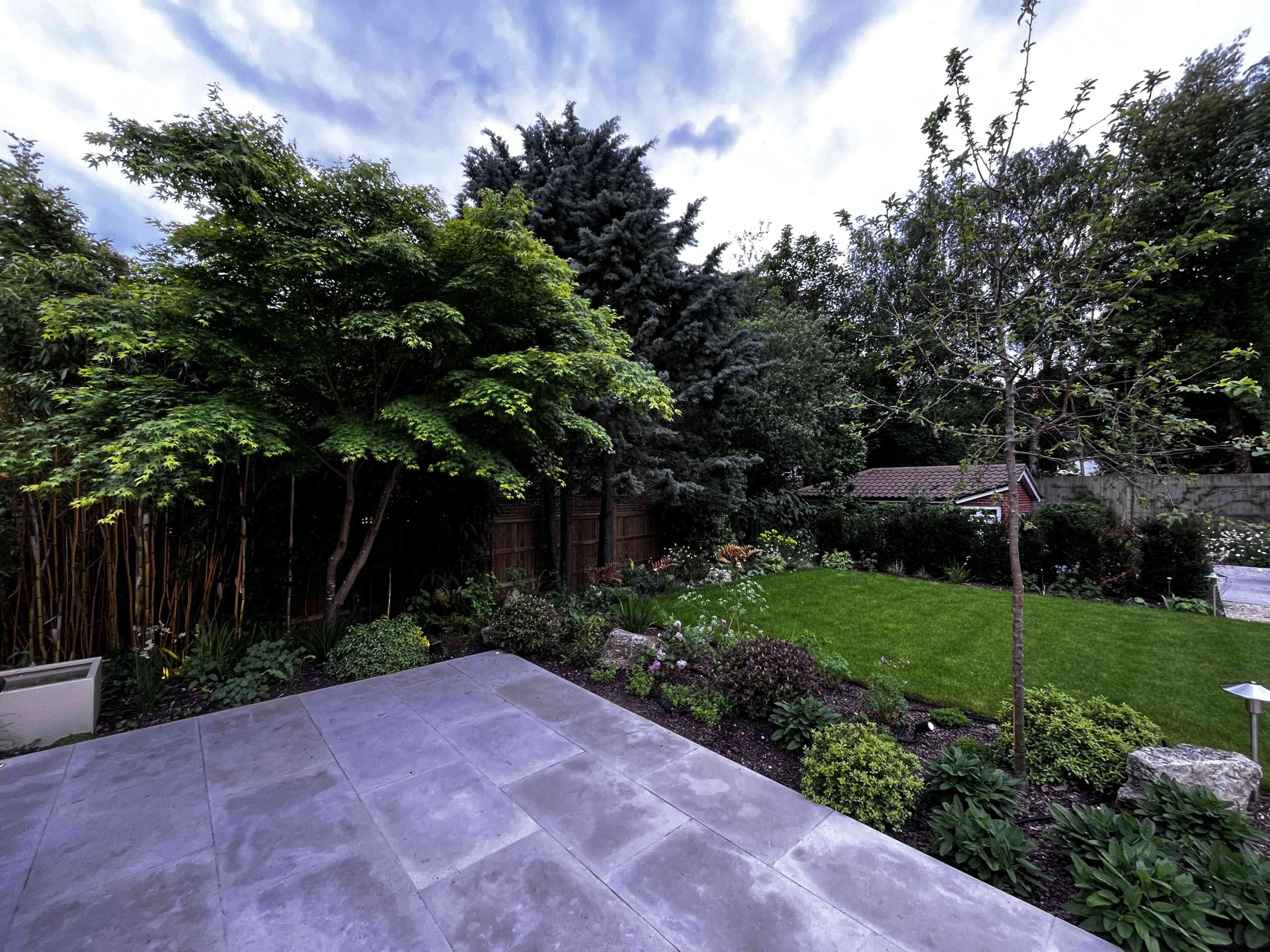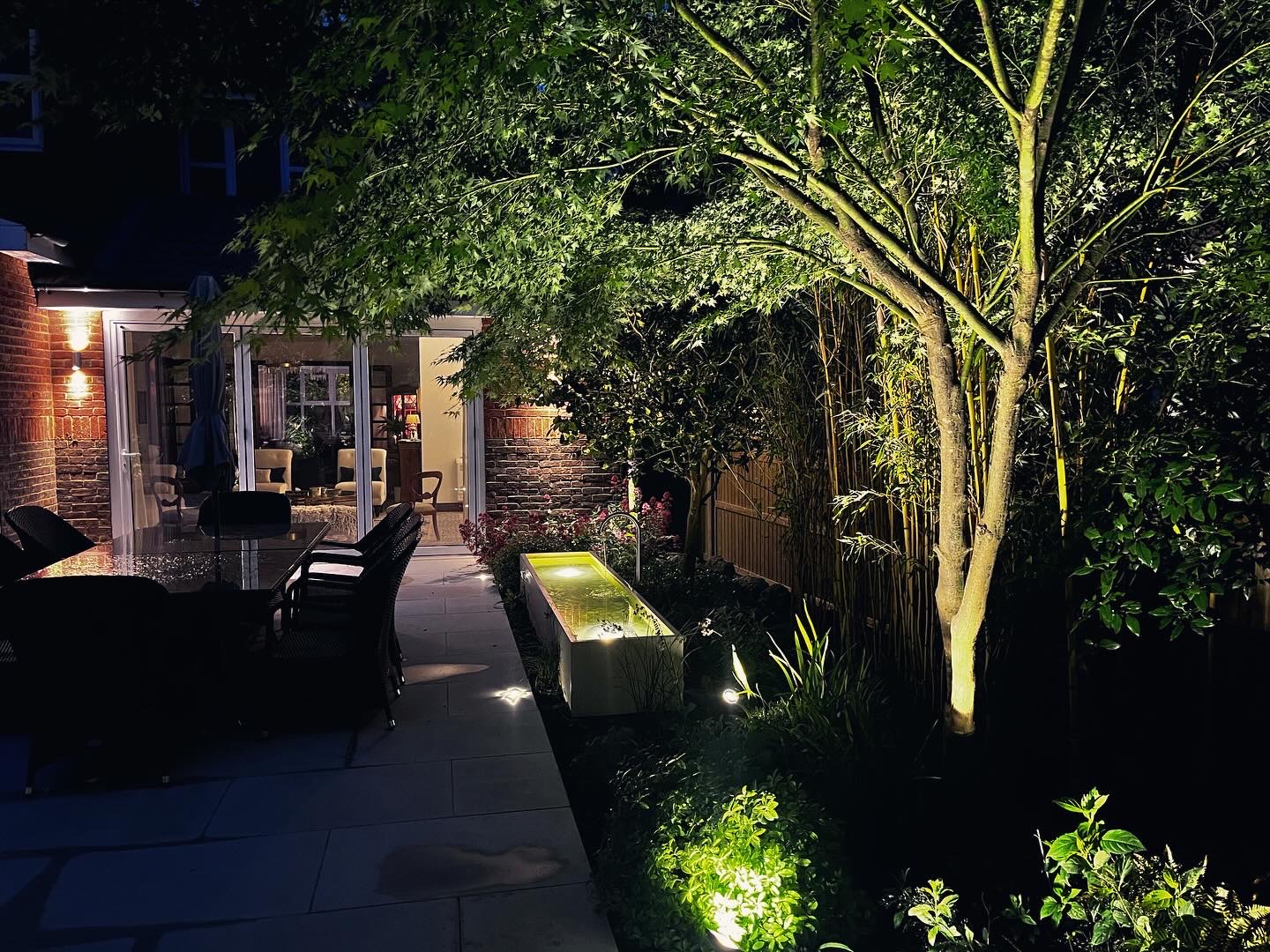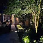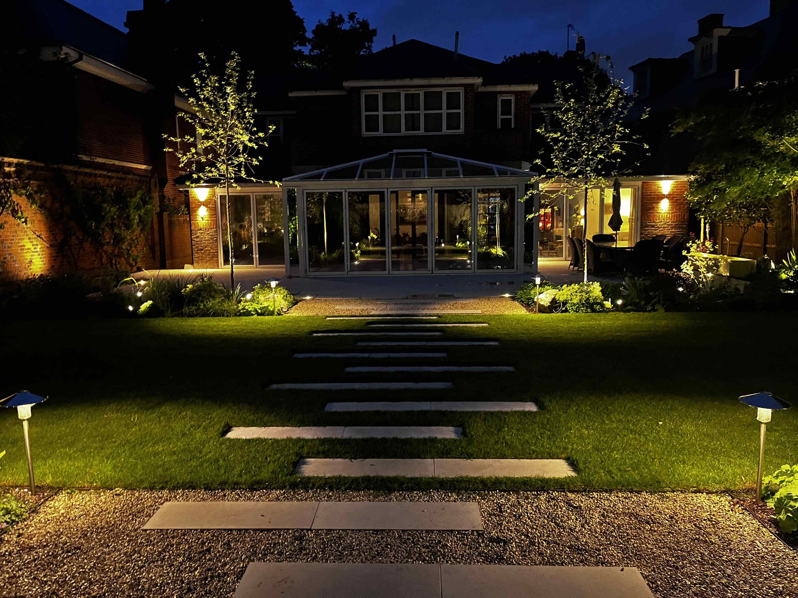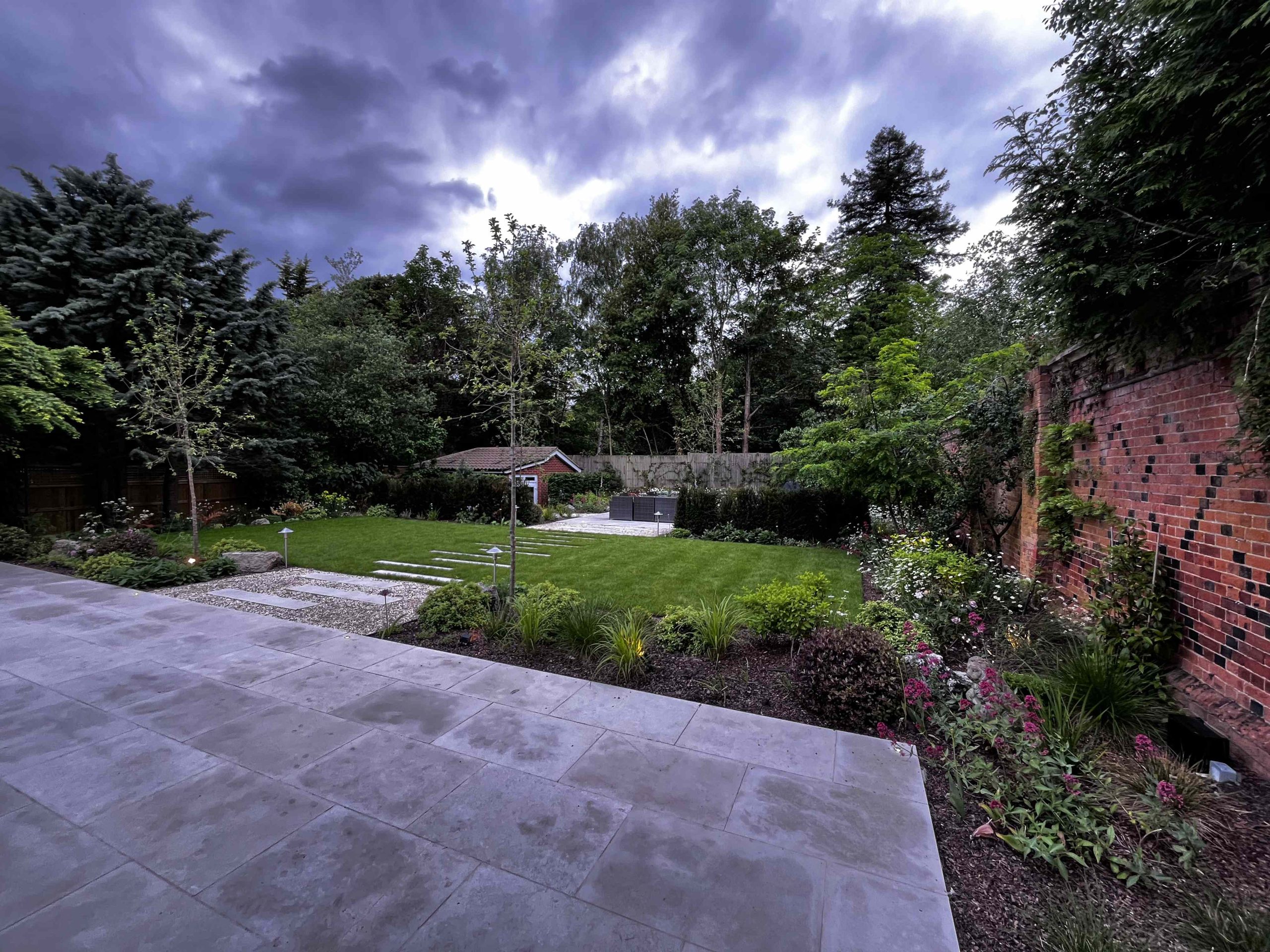 The sole purpose for this project was to turn the garden into a space that the clients could socialise in and enjoy comfortably. We started with a blank slate of a garden but it had this beautiful 3m high Tudor brick wall that ran the length of the garden. We used that to our advantage, clearing the vegetation away to make it more visible, but installing vines and climbing plants to enhance the character of the wall. Two large limestone terraces bookend the space, anchored by 4 crab apple trees. The planting was a mix of ornamental herbaceous, deciduous grasses and evergreen structure in the form of clipped mounds and domes to provide structure in the winter months. Lighting plays a key role in this garden as it’s a social space. The vegetation that surrounds the large terraces are to act as points of interest to work with the hardscape. But the generous scale of the hardscape is the key to this design.