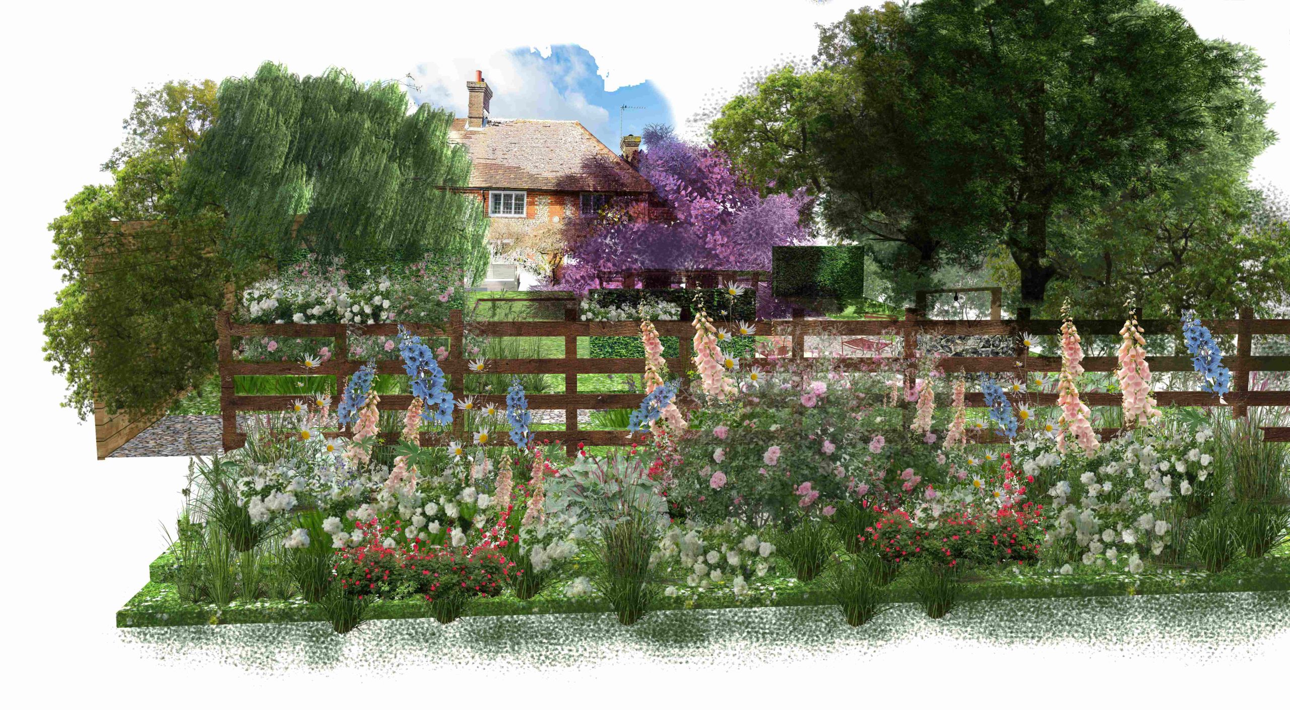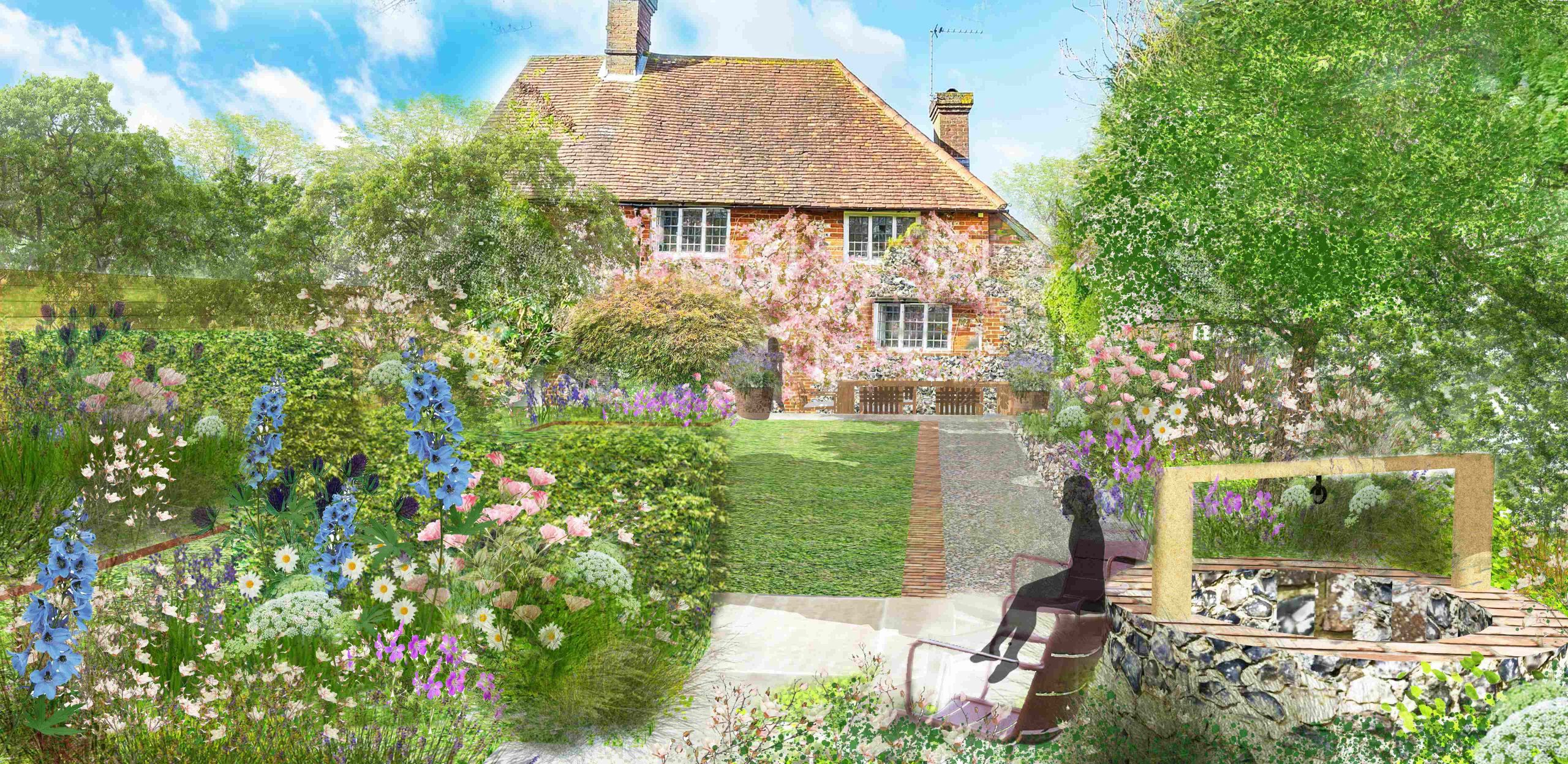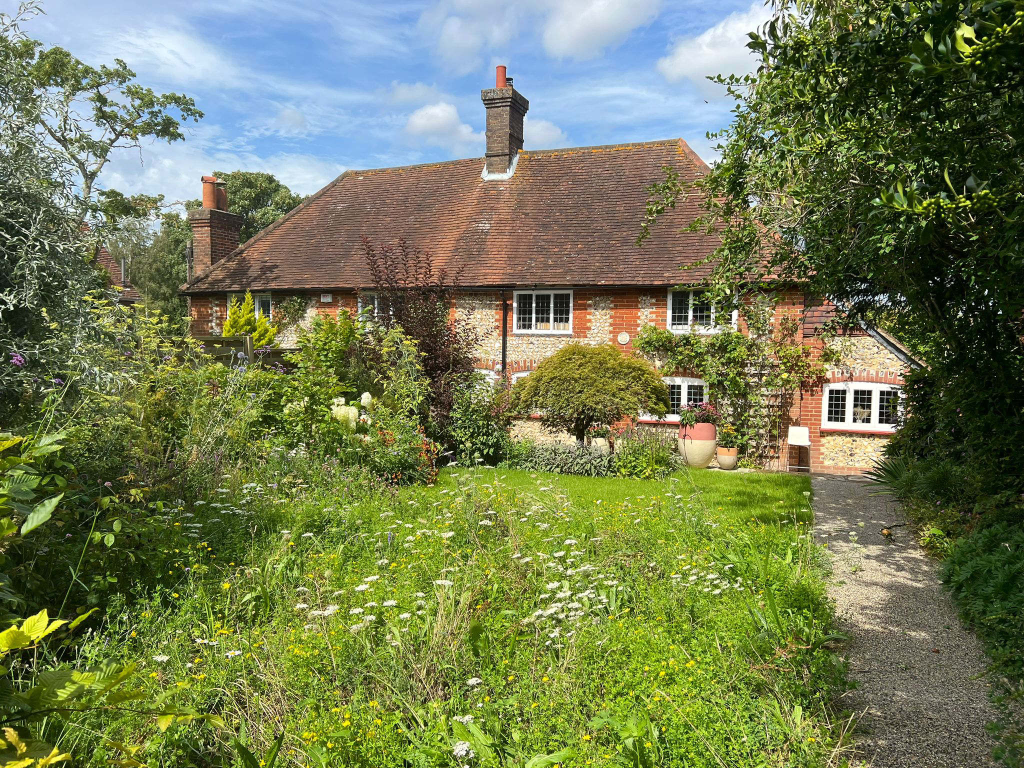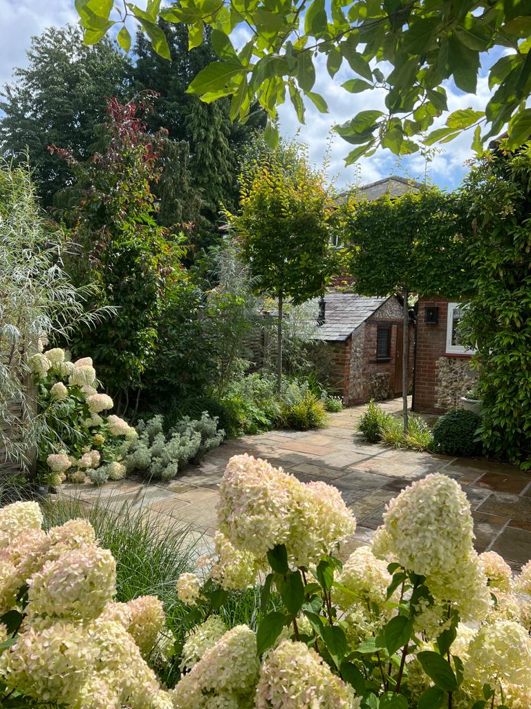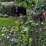 Nestled at the edge of a quiet lane, the newly built cottage garden radiates an effortless charm, blending traditional aesthetics with subtle modern touches. This project completed in Summer 2022 was a project I did as part of working with Stephen Woodhams Design. It’s a quintessential English cottage with 16th century origins, the client wanted to re-vamp the original garden as it was overgrown and was impractical and very tight to manoeuvre around. We first sought to make sense of the level changes and re-build the walls using flint cobbles to emulate the nearby churchyard. Continuing on this trend, we used reclaimed yorkstone from the churchyard as the main paving material along with corten metal edging that really made the garden feel as it had maturity and grounded within the landscape. The planting focuses on cottage gardens and takes a lot of inspiration from the gardens at Great Dixter in Rye, Kent and from Sissignhurst. We planted a large Nyssa sylvatica tree on the corner of the property to act as a beacon to the house as it’s down a very tight, country lane and the Nyssa is something you will see first. We placed a terrace just opposite a near by field of horses so you can always see the horses grazing as you sit and relax with friends and family. We planted half of the lawn area with meadow turf to bring the surrounding meadows into the garden and give you a feel of being surrounded by nature.