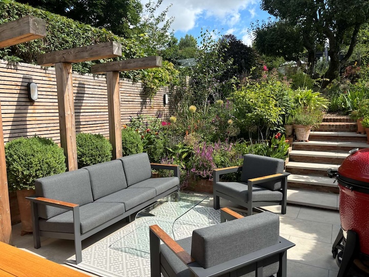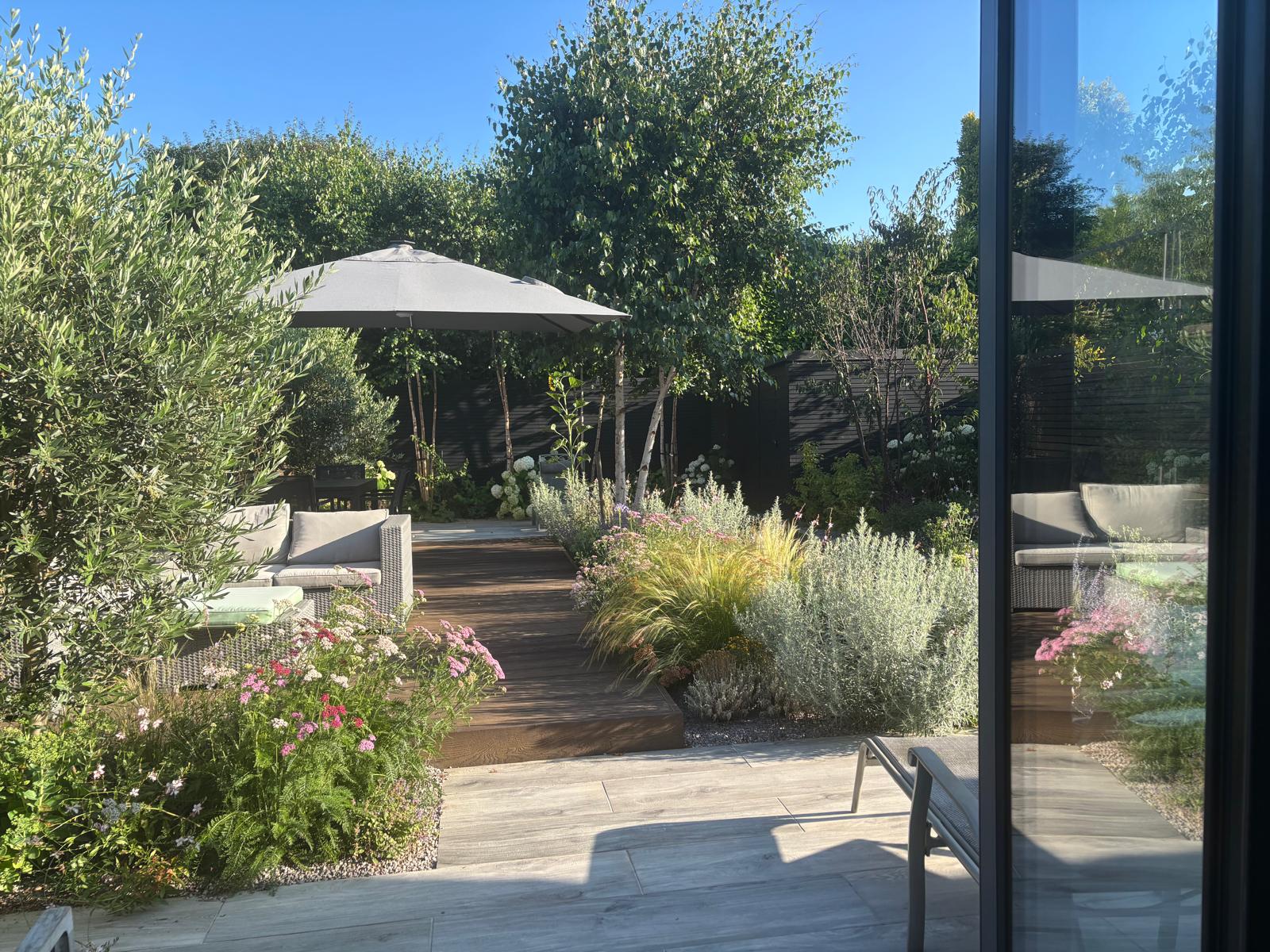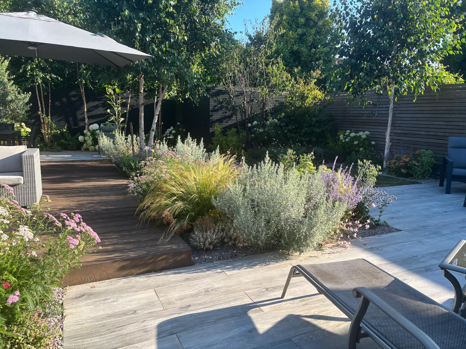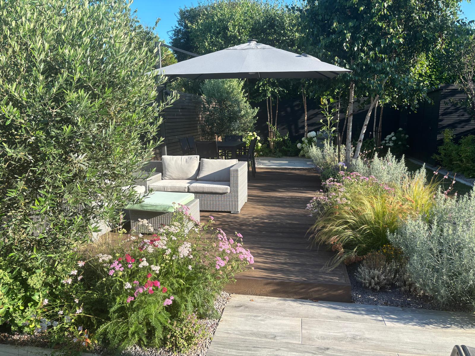 The modern & contemporary home interior was extended into the garden to deliver spaces that felt linked together. The design focused on creating a large space for entertainment and relaxation immediately outside the conservatory with a seamless inside-out flow. This required significant excavation with retaining walls which were coherently matched to the bricks of the house.The owners were keen gardeners and the design features extensive low maintenance, drought tolerant & resilient planting which delivers year round interest. The design concept is grounded in the local Chilterns heritage landscape.