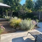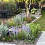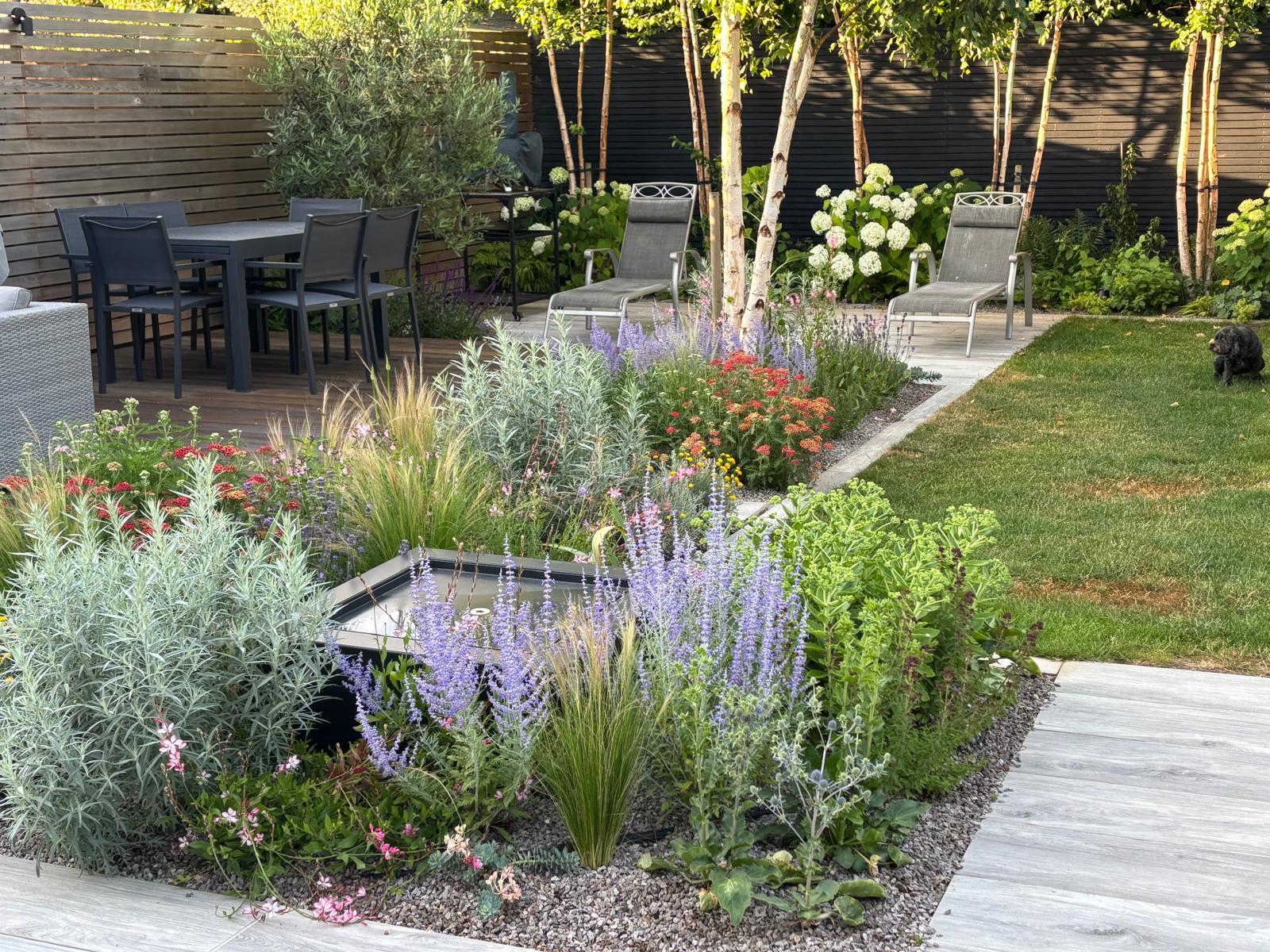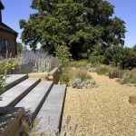 The design of the garden takes the modern linear lines of the house to create a series of entertainment and relaxation terraces around the garden. The planting is inspired by the organic shapes of the inlets and vegetation of the Essex marshes to create a low maintenance gravel garden which provides colour, fragrance and interest across the seasons. Birch trees are used to remove the dominance of the conifer hedge.