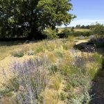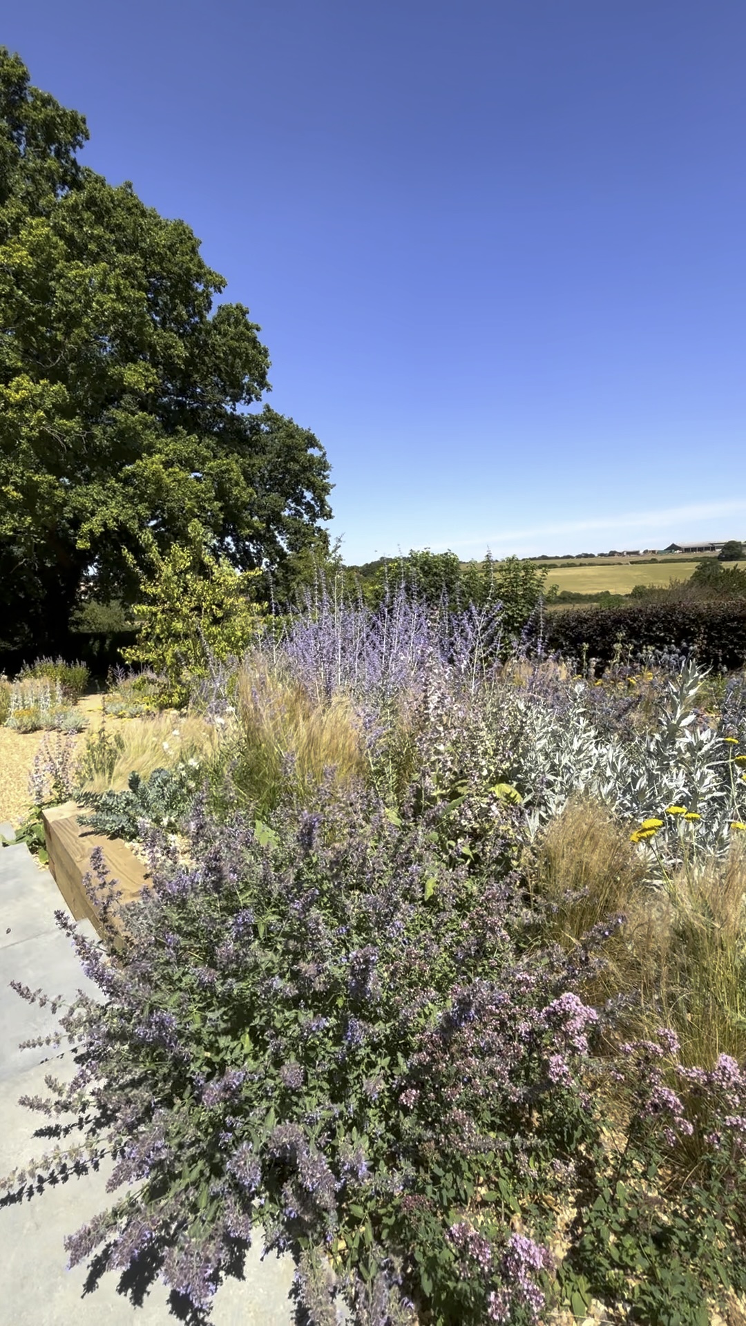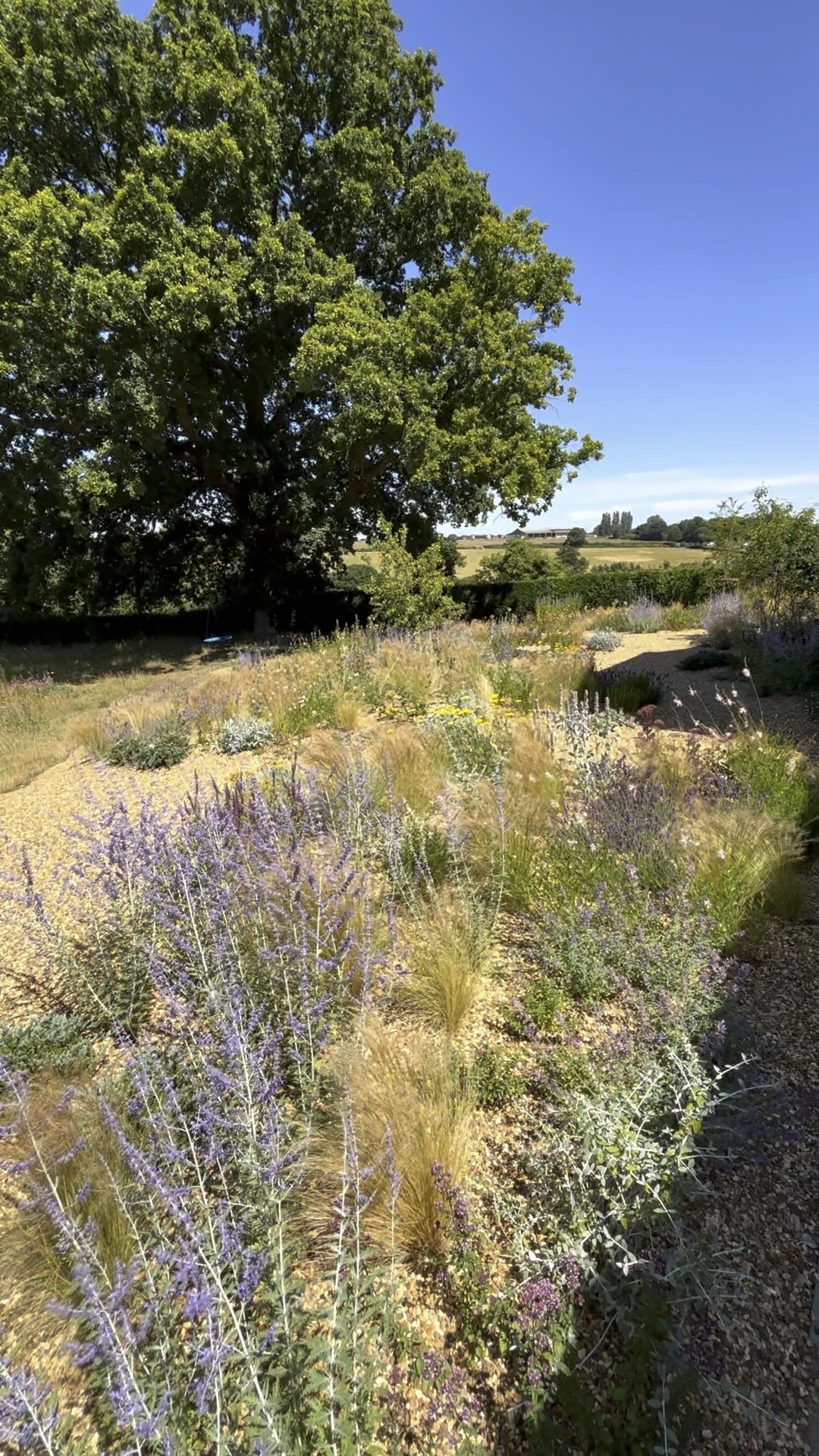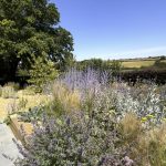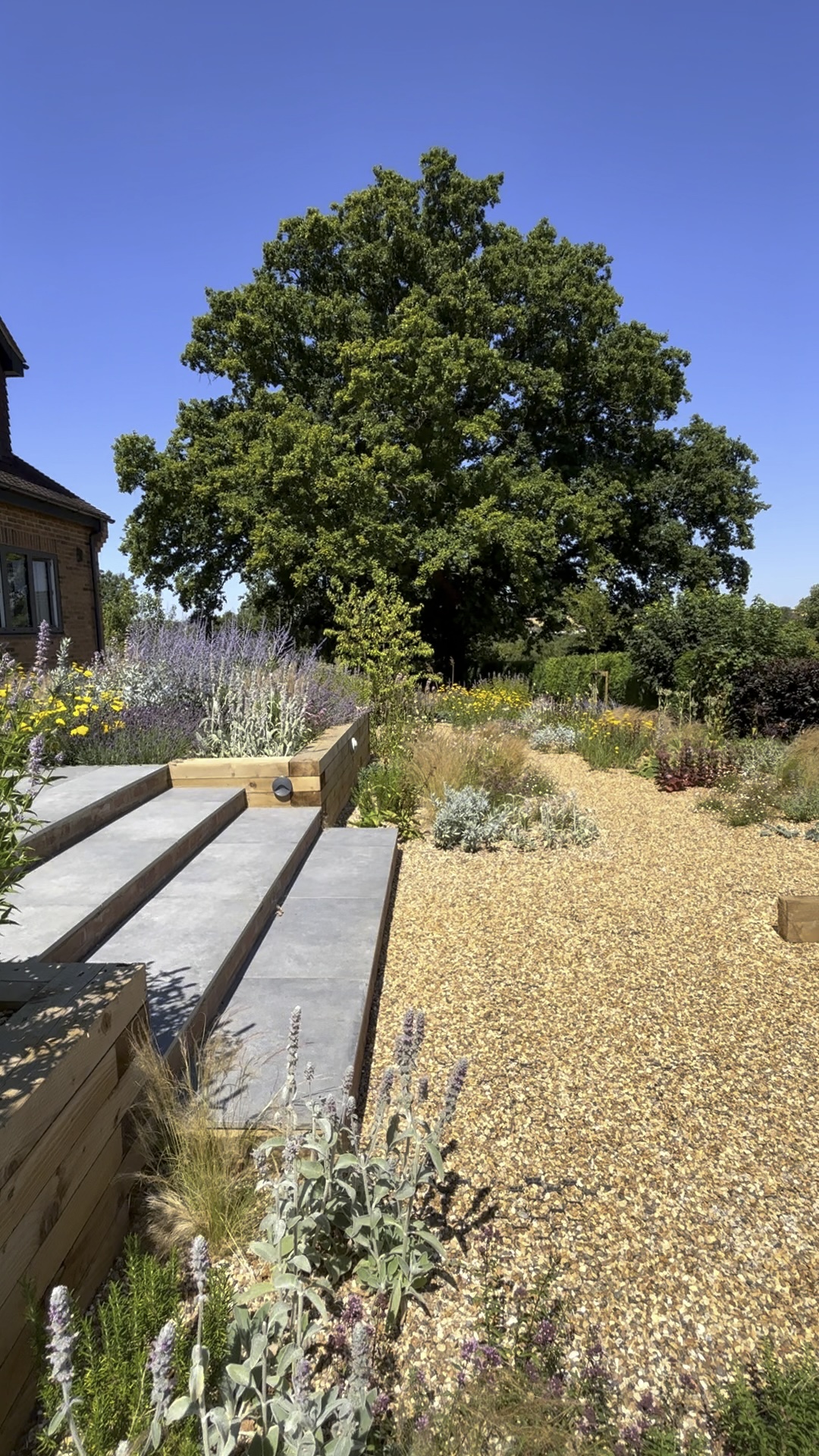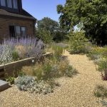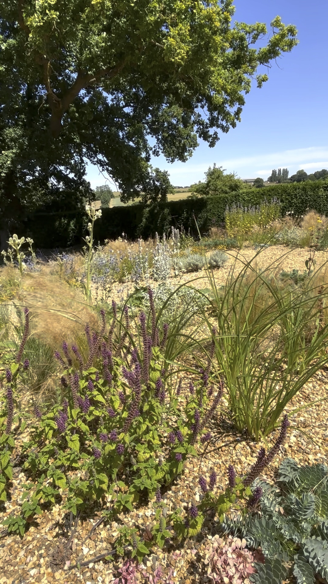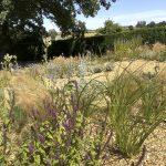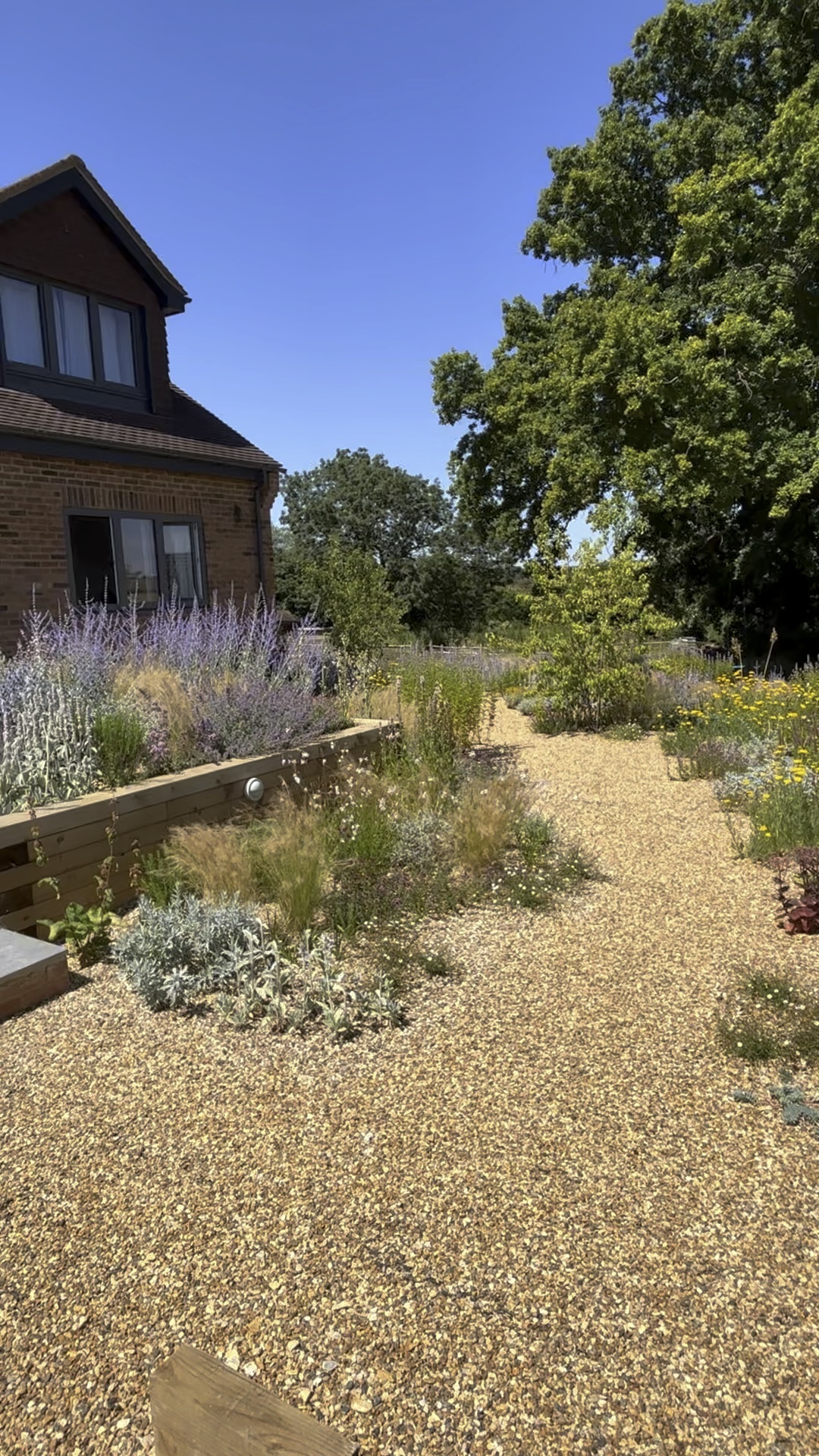 The design takes its inspiration from the flowing Ranunculus vegetation forms found within the local chalk streams. The flowing design leads you through the loose, naturalistic planting along gravel pathways. Drought tolerant, pollinator friendly planting thrives within the open gravel conditions. Places to sit and relax soaking up the fragrant and colourful planting. The gravel garden grounds the modern home within the landscape. The planting is resilient, colourful, fragrant and pollinator friendly providing year-round interest. Native multi-stem trees accentuate vistas and views across the rolling Chiltern Hills.