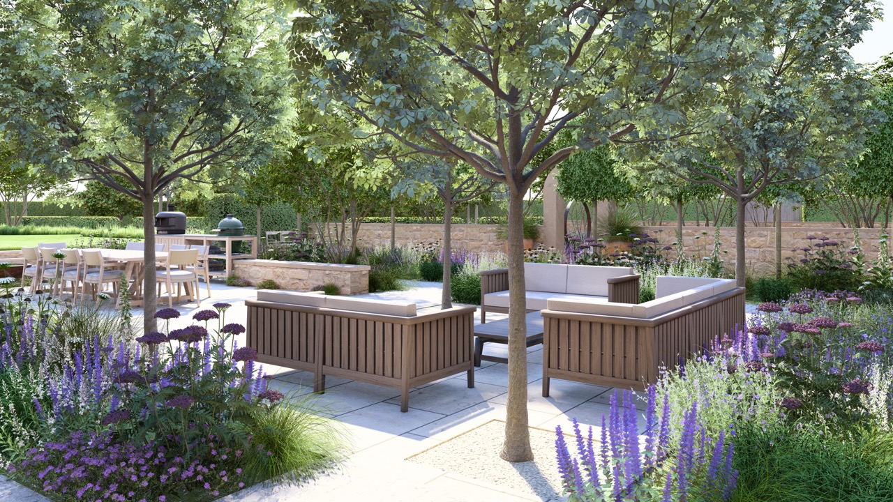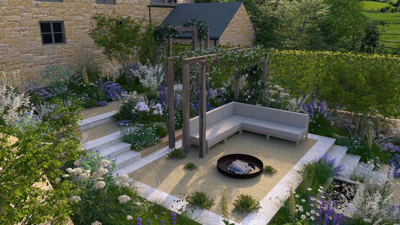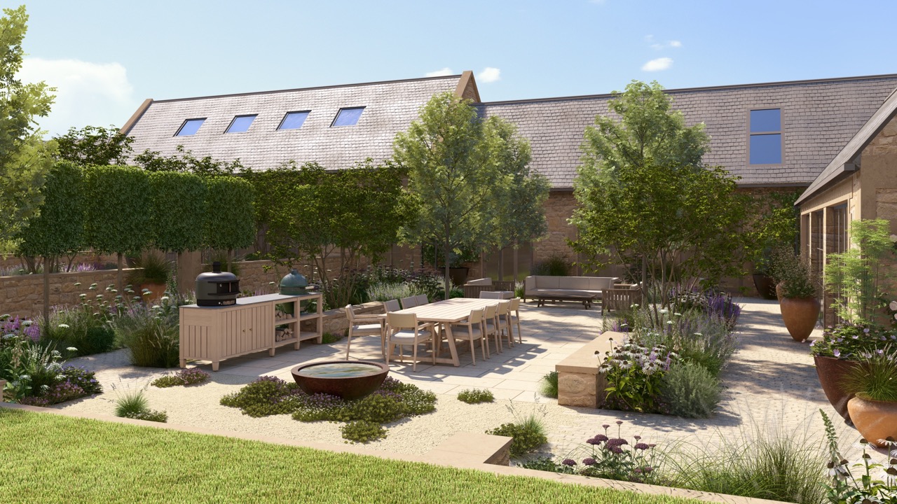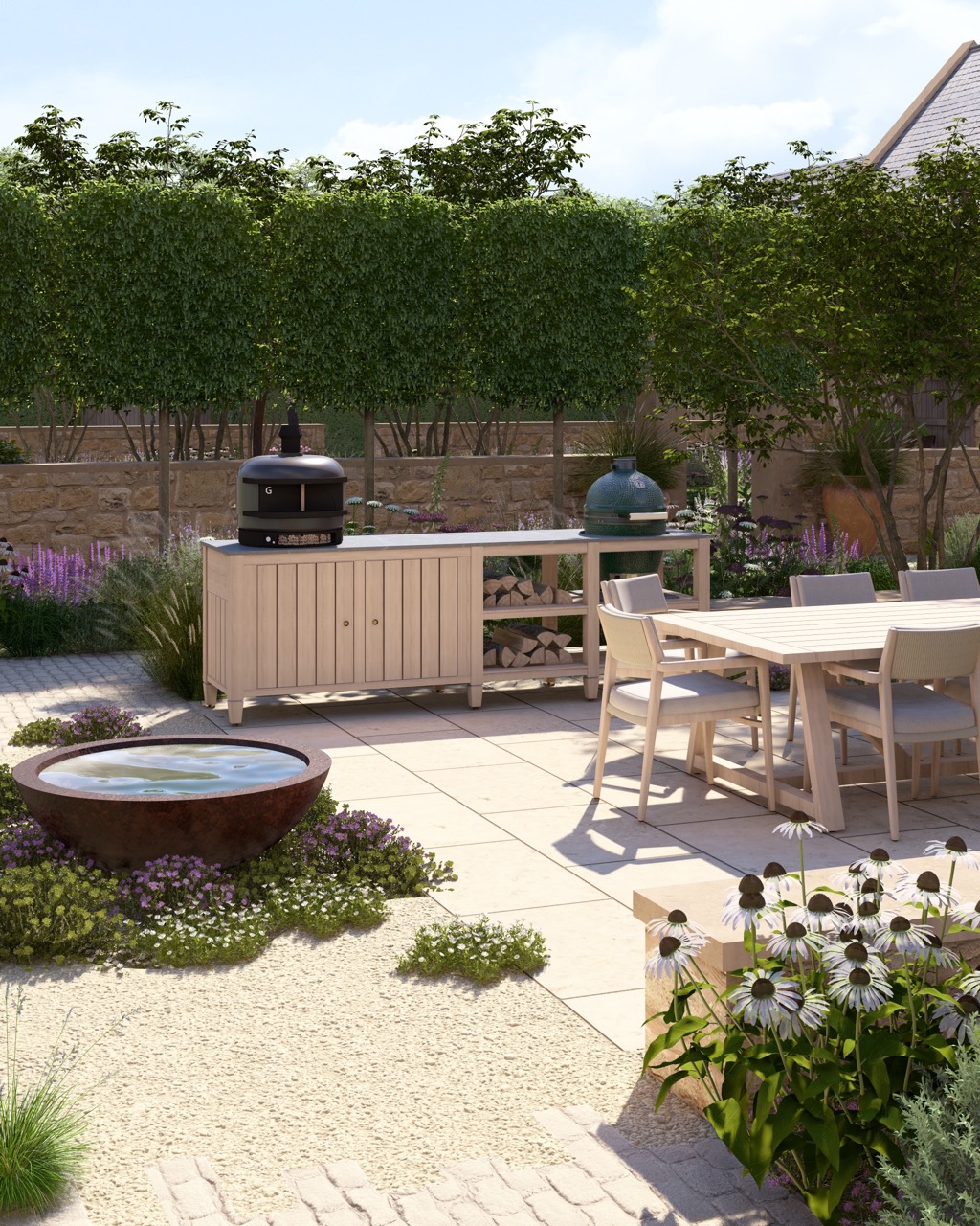 Natural paving and walling materials complement the local Cotswolds palette. And two three-part oak pergola structures provide shade and a sense of shelter and enclosure over both seating areas.