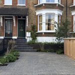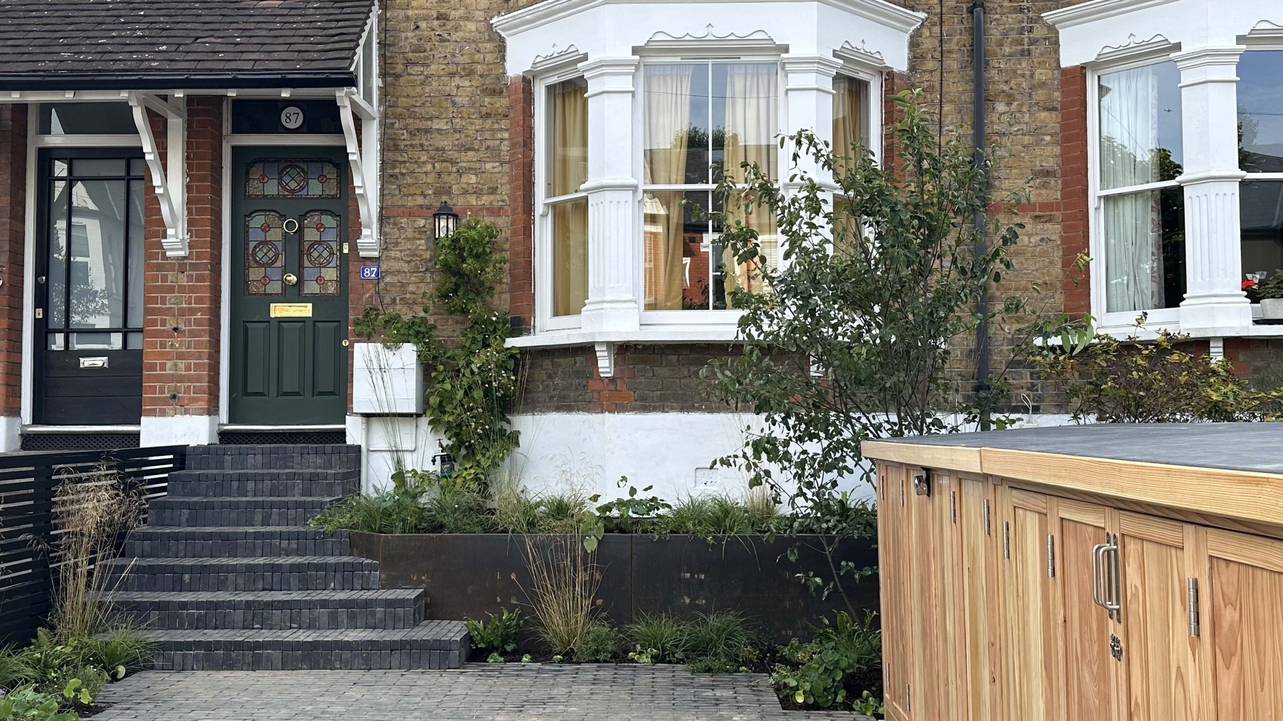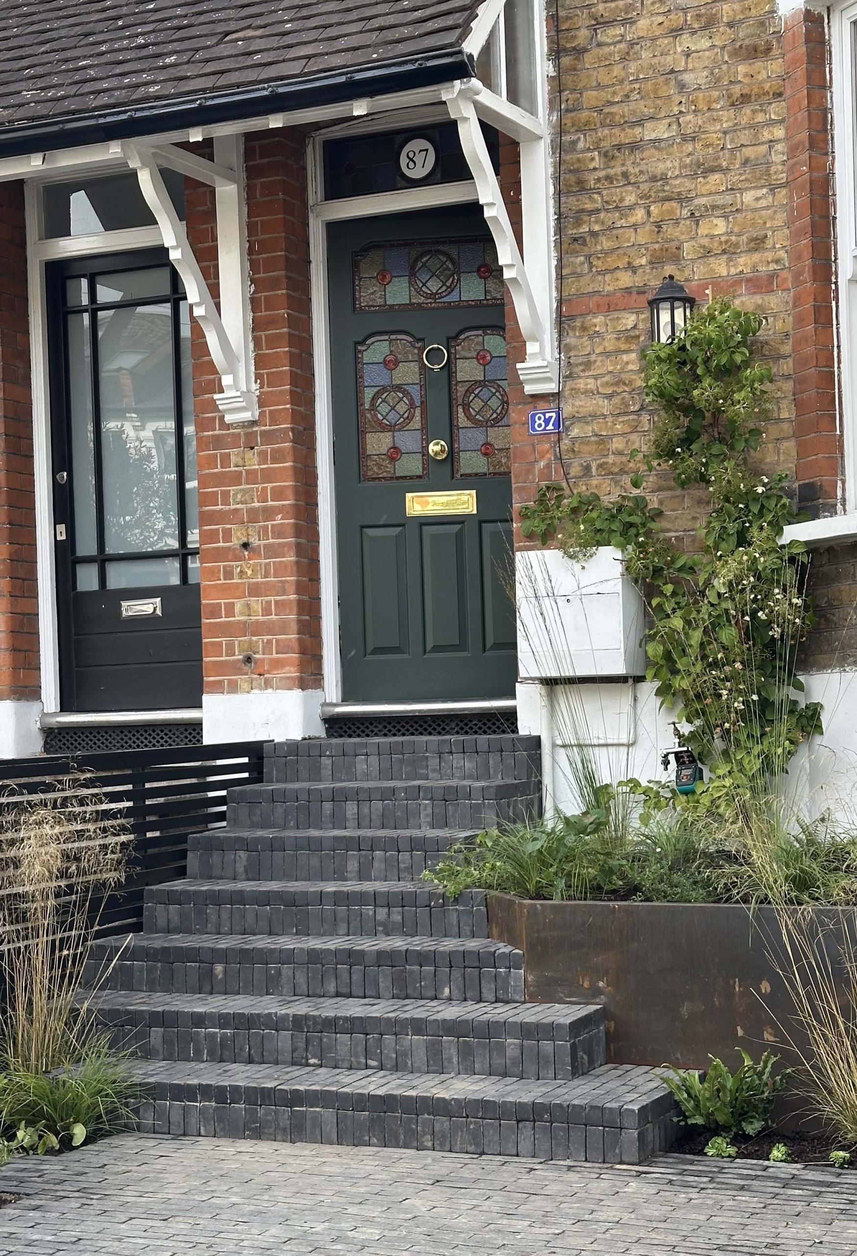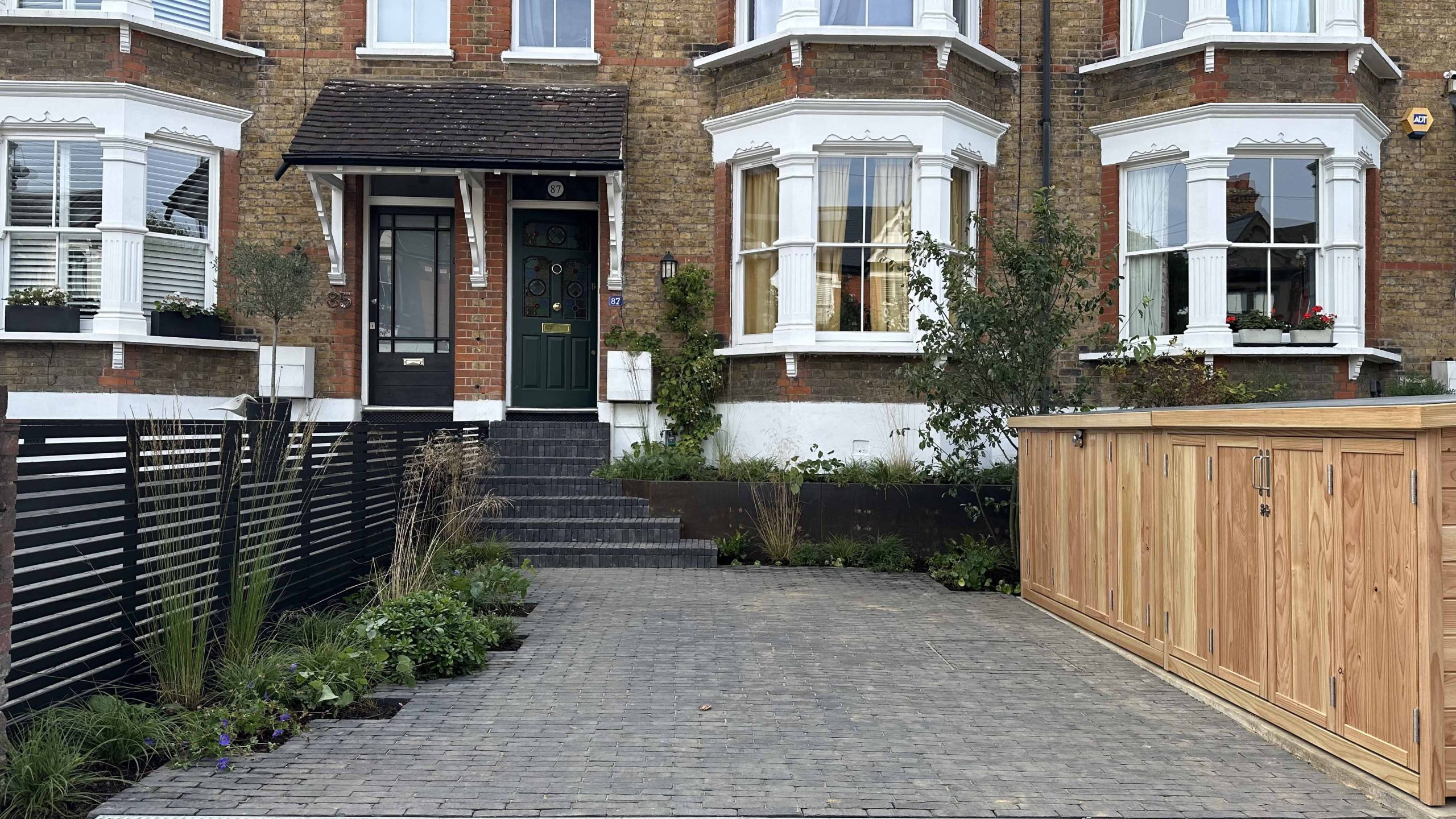 This compact front garden transforms a highly functional space into a calm, green arrival. The design retains car access and discreet storage for bicycles and bins, while shifting the balance away from hard surfaces and towards planting.