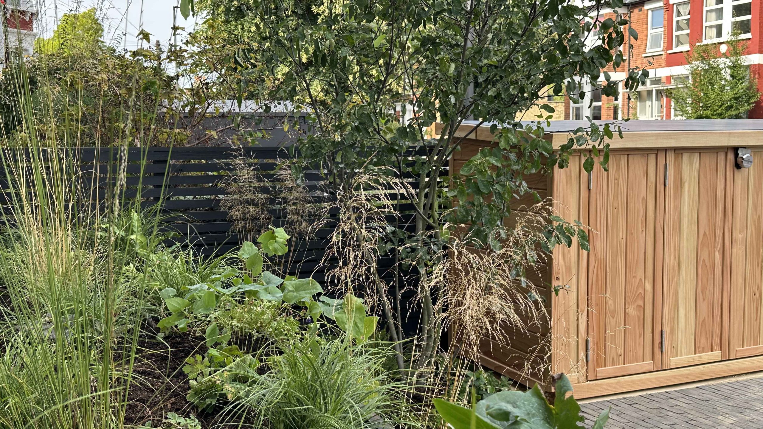 Natural materials and bespoke timber storage integrate seamlessly with the architecture, demonstrating how even the smallest urban garden can become a meaningful, nature-led space.